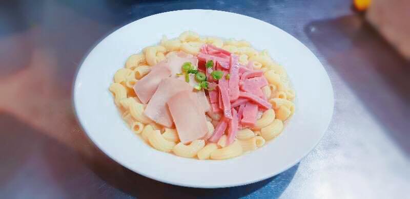 ซุปครีมรสกลมกล่อม เสิร์ฟพร้อมแฮม เป๋าฮื้อสไลซ์ และไข่ สามารถเลือกได้ทั้งบะหมี่กึ่งสำเร็จรูป มักกะโรนี หรือสปาเก็ตตี เหมาะสำหรับคนที่ชอบรสละมุนและทานง่าย